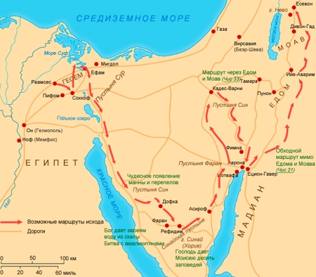 Потомки Авраама, евреи, остававшиеся в Египте примерно 400 лет, постепенно были порабощены египтянами. В конце концов, после ряда страшных бедствий, Моисей вывел их из Египта, проведя через Красное море и пустыню. Мы не можем точно сказать, каким именно путем они шли — карта показывает маршрут, о котором говорит предание. (Они не могли идти по прямой прибрежной дороге, так как её стерегли египтяне). На горе Синай Моисей получил Десять Заповедей. Позднее в Ханаан были отправлены разведчики, чтобы «высмотреть» Обетованную Землю. В пустыне евреи провели сорок лет. После смерти Моисея они перешли через реку Иордан и, выйдя из Моава, вступили в Землю Обетованную. (Исход, Числа)