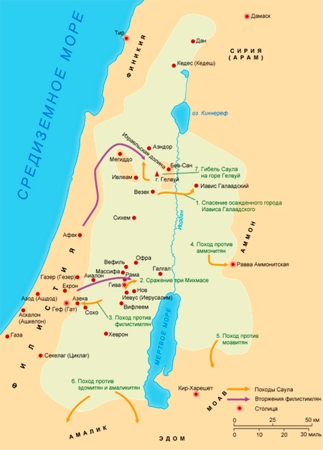 Филистимляне представляли постоянную угрозу для израильтян, которые в конце концов пожелали, чтобы ими правил царь, как у других окружавших их народов. Последний судья Израиля Самуил помазал на царство Саула. Саул оказался прекрасным воином; он отразил натиск аммонитян на востоке и филистимлян на западе. Однако он невзлюбил своего молодого военачальника Давида, и счастье отвернулось от него. В сражении на горе Гелвуй войско Саула было разбито филистимлянами, а сам он погиб. 1Цар. 9–31