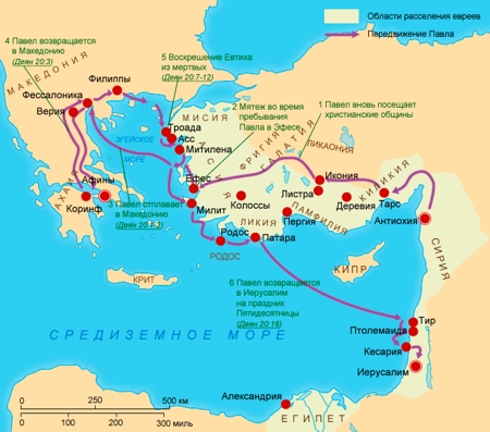 Около 53 г. Павел в одиночку отправился в свое третье, самое длительное путешествие. Два года он провел в Эфесе. В Троаде к нему присоединились представители нескольких церковных общин; вместе с ним они отправились морским путем в Иерусалим, везя дары для нуждающихся христиан. Деян. 18:23 — 21:16